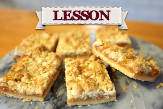 Easy to make and absolutely delicious! Pat half of your dough into the baking tin and after baking, spread with jam and dried apricot, finally add an oaty, nutty crumble topping. Such a lovely snack. You'll take home your bake as an 18cm square for you to cut at home. This lesson is for up to 6 people.